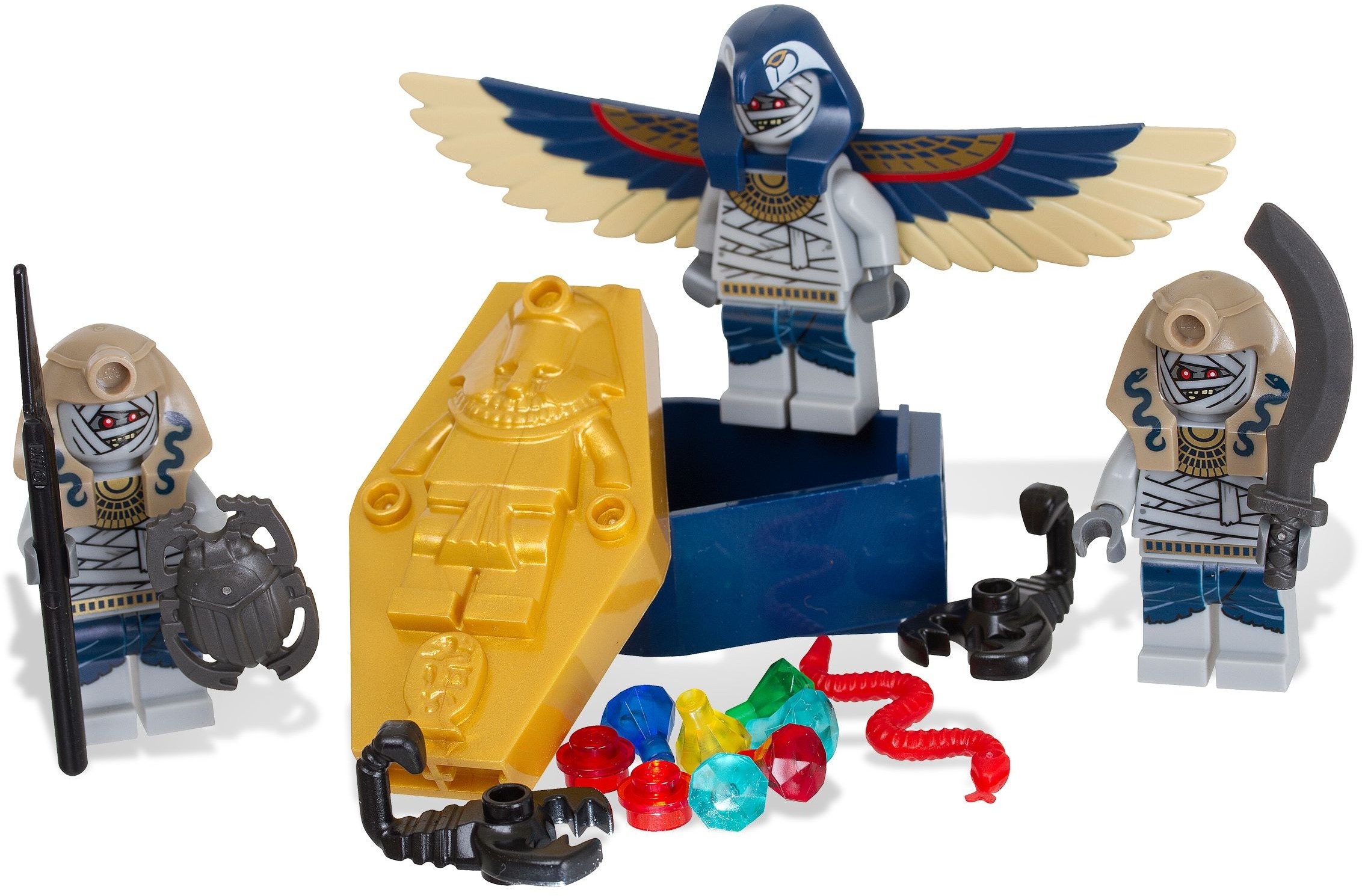 В состав набора входят 3 минифигурки: Летающая мумия и два Заклинателя змей, а также несколько видов оружия: копьё, секира и щит в виде жука-скарабея.