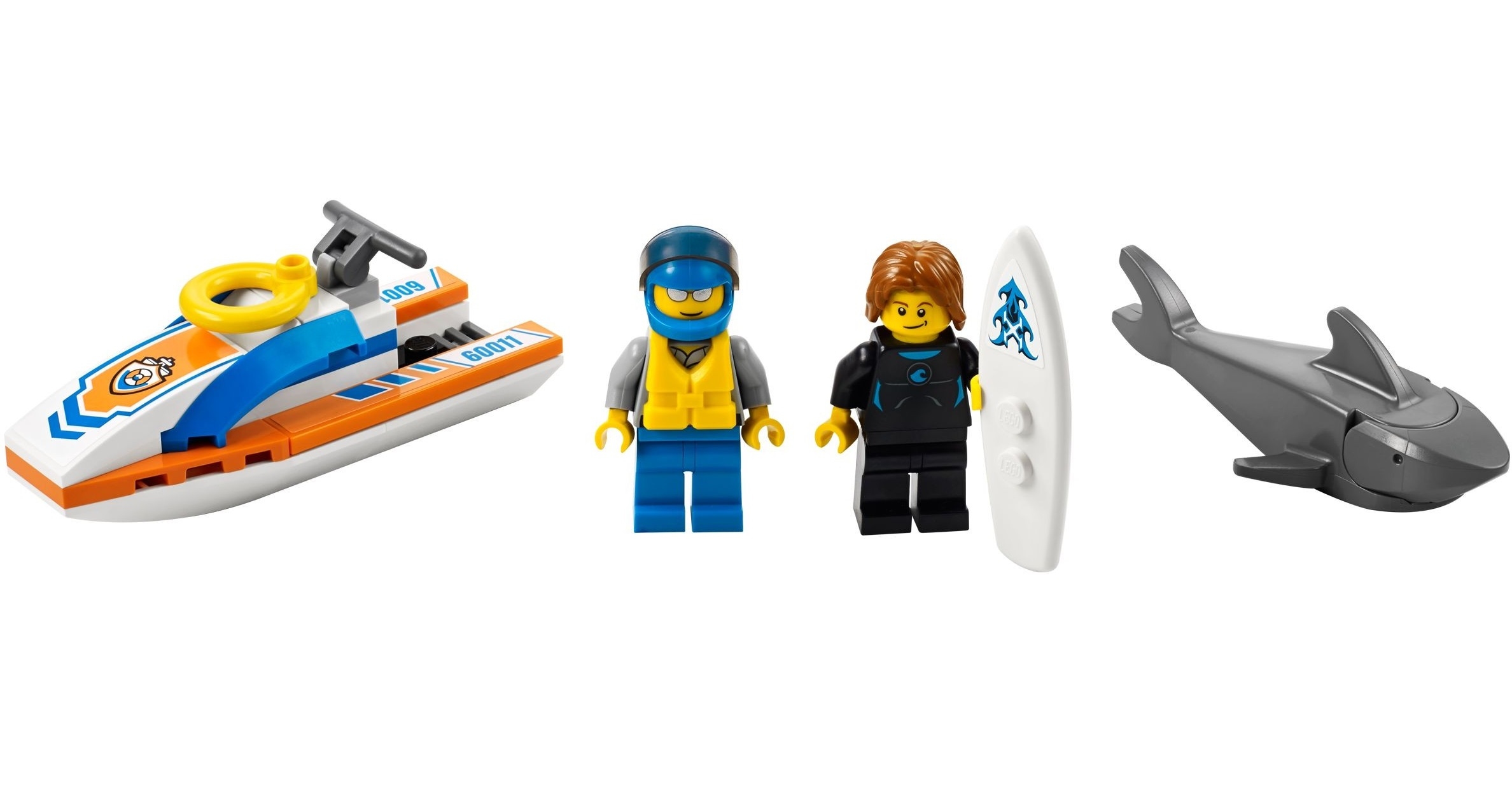 В наборе Лего 60011 Вы найдёте минифигурки сёрфингиста и спасателя, а так же шлем, спасательный круг, доску для сёрфинга и большую акулу.