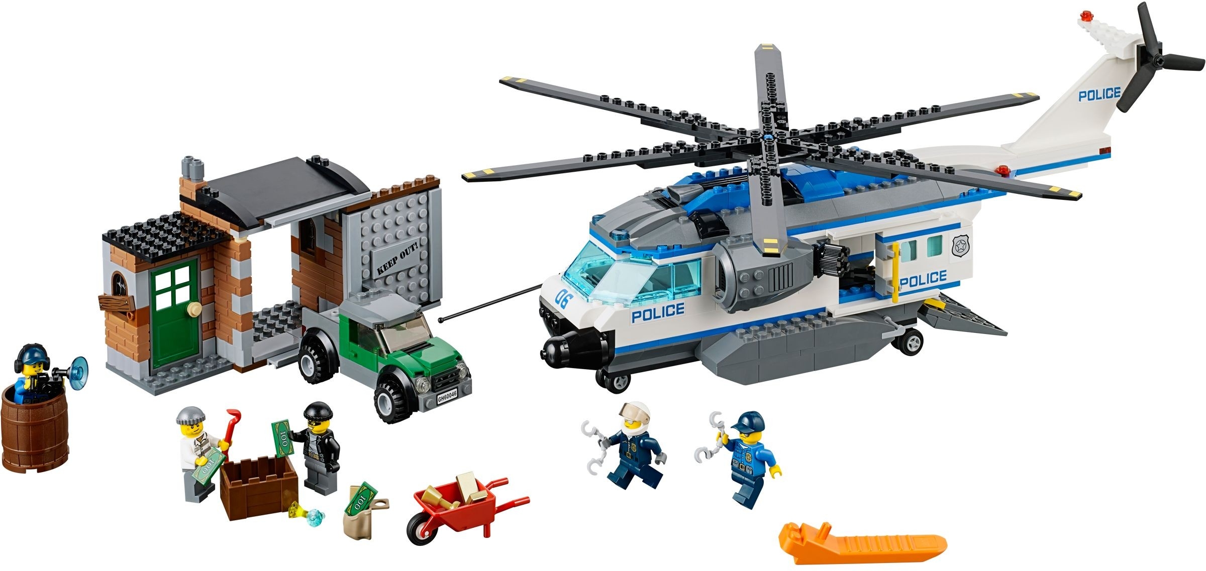 В наборе Лего 60046 Вы найдёте 5 минифигурок и множество аксессуаров: тележка, золотые слитка, драгоценные камни, деньги, мешок, ящик, отмычка-лом, наручники и подслушивающее устройство с наушниками.