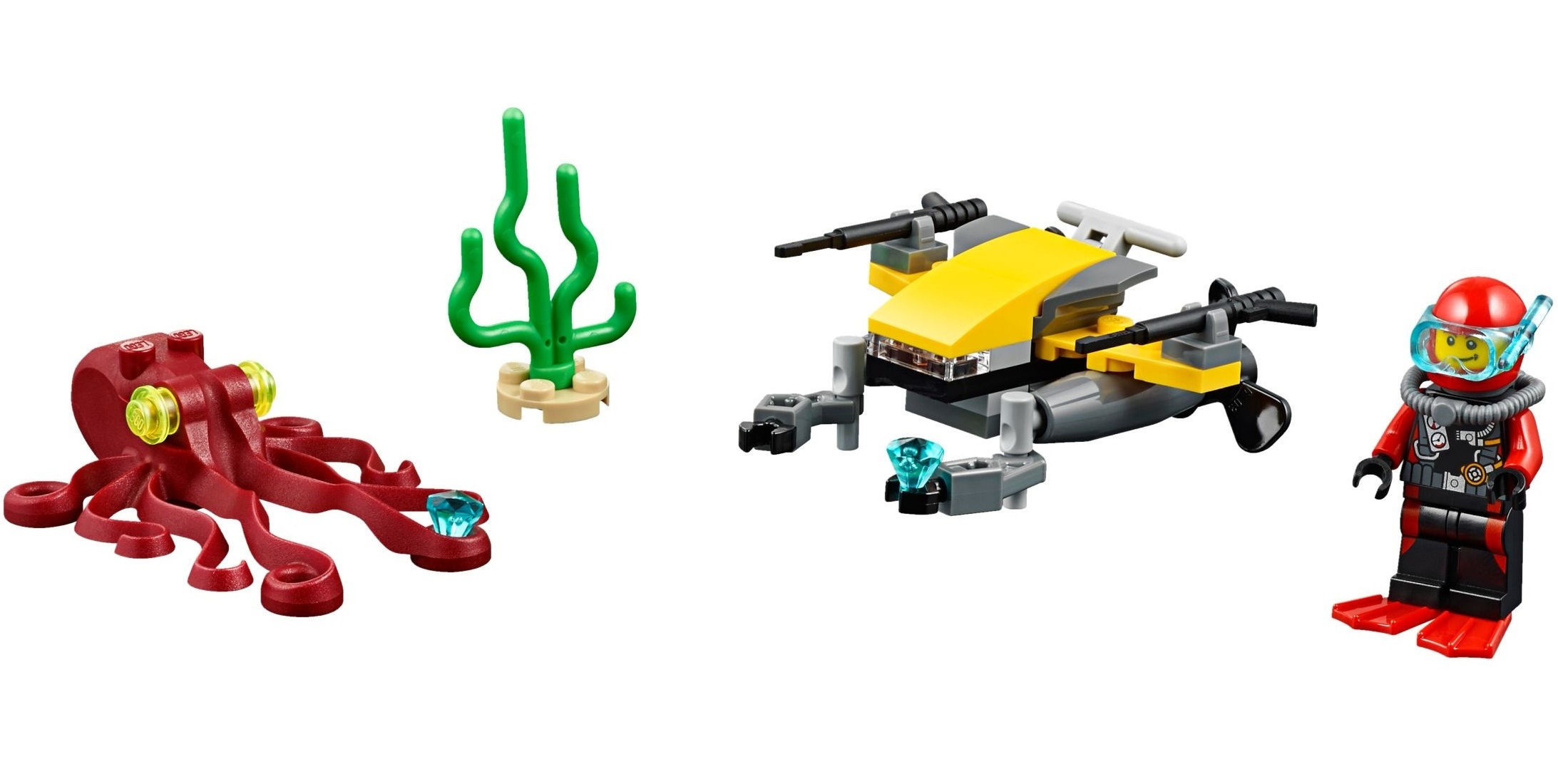 В наборе Вы найдёте модель глубоководного скутера, морское растение, драгоценные камни, фигурку осьминога и минифигурку ныряльщика в водолазном костюме.