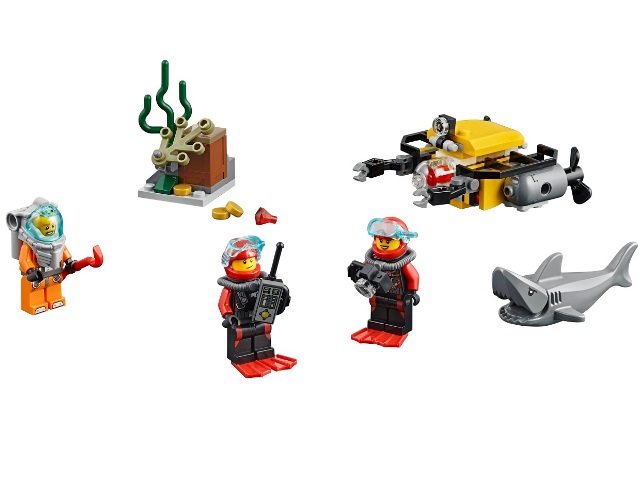В наборе Вы найдёте модель батискафа, сундук с сокровищами, фигурку акулы с открывающейся пастью и 3 минифигурки с аксессуарами: 2 аквалангиста и глубоководный ныряльщик.