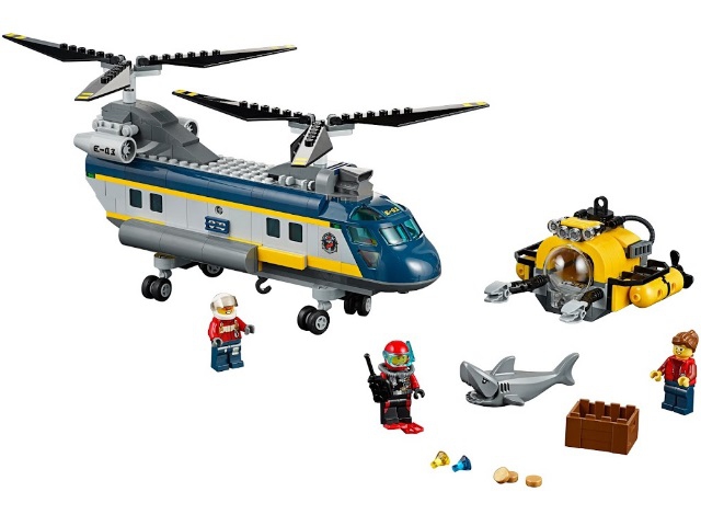 В наборе Вы найдёте вертолёт с множеством активных функций, жёлтый глубоководный батискаф, ящик с драгоценностями, фигурку акулы с открывающейся пастью и 3 минифигурки с аксессуарами: пилот вертолёта и 2 ныряльщика.