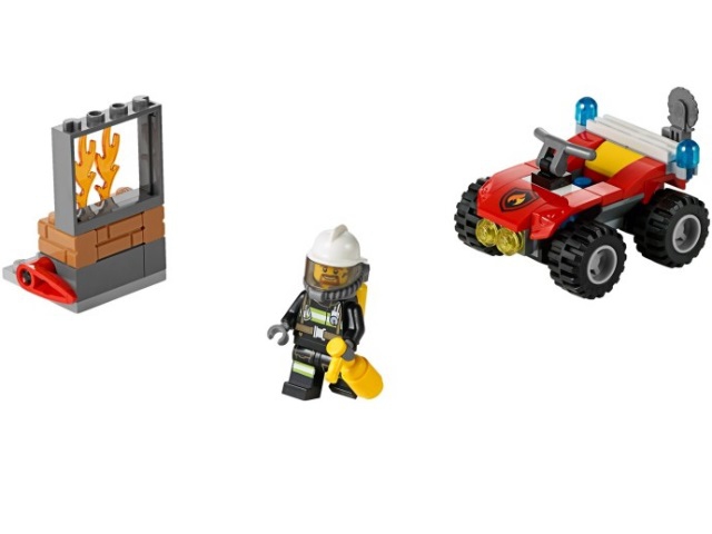 Отправляясь на тушение небольшого возгорания, пожарный из набора Лего 60105 решил воспользоваться своим быстрым квадроциклом. Его корпус выполнен из красно-серых деталей с добавлением логотипа на капоте. Центральная часть в конструкции отведена месту водителя и рулевому управлению.