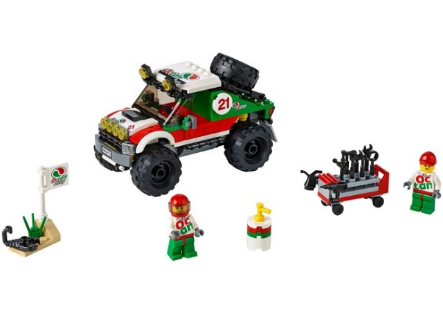 Чтобы принять участие в гонках по песчаным дюнам, Вам понадобится мощный и сверхпроходимый внедорожник из набора Лего 60115. Его прочный корпус выполнен из бело-красно-зелёных деталей с добавлением логотипов гонки и номера участника.