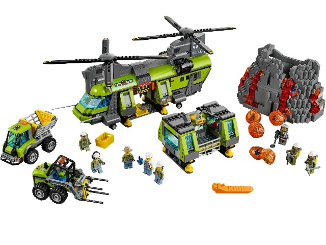 Чтобы создать настоящую исследовательскую базу рядом с извергающимся вулканом, Вам понадобится транспортный вертолёт из набора Лего 60125. Его вместительный салатово-серый корпус предназначен для перевозки особо тяжёлых и габаритных грузов. Для этого в конструкции вертолёта предусмотрено несколько секций. Сзади находится прямоугольный отсек с откидывающимся пандусом. В нём можно перевозить контейнеры с инструментами или найденные редкие минералы.