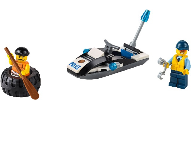 Также в наборе присутствуют 2 минифигурки с аксессуарами: полицейский с наручниками и воришка с веслом.