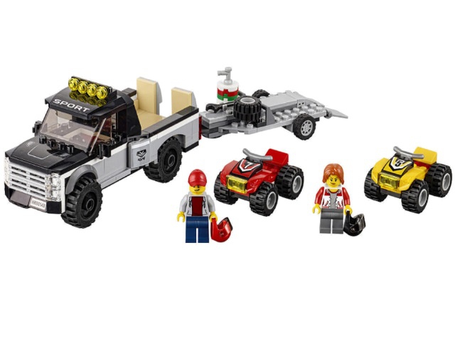В наборе присутствуют элементы для создания двух квадроциклов и двух минифигурок с аксессуарами для игры.