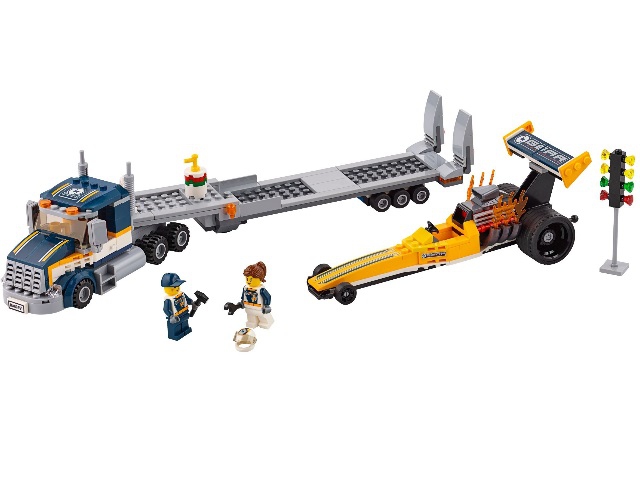 В наборе Лего 60151 Вы найдёте уменьшенную копию гоночного драгстера. Его жёлто-чёрный корпус эффектно смотрится на трассе. Спереди виден длинный и узкий капот, делающий кузов более аэродинамичным. Подобно молнии он прорезает воздух и мчится к финишу. В этом ему помогает огромный двигатель с треугольным воздухозаборником. Во время гонки мотор работает на предельной мощности, о чём свидетельствуют языка пламени, вырывающиеся из шести выхлопных труб. При таком ускорении возникает опасность опрокидывания автомобиля или потеря им сцепления с трассой.