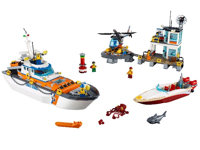 Из деталей набора Лего 60167 Вы сможете собрать масштабную модель корабля береговой охраны. Его корпус выполнен в белом цвете с добавлением оранжевых и синих акцентов. Условно всю конструкцию можно разделить на 4 игровых зоны. Спереди на серой палубе устроена дозорная площадка. На ней предусмотрено место для одного спасателя, следящего за всем, что происходит за бортом. В тёмное время суток он может воспользоваться противотуманным прожектором, закреплённым на подвижном основании.