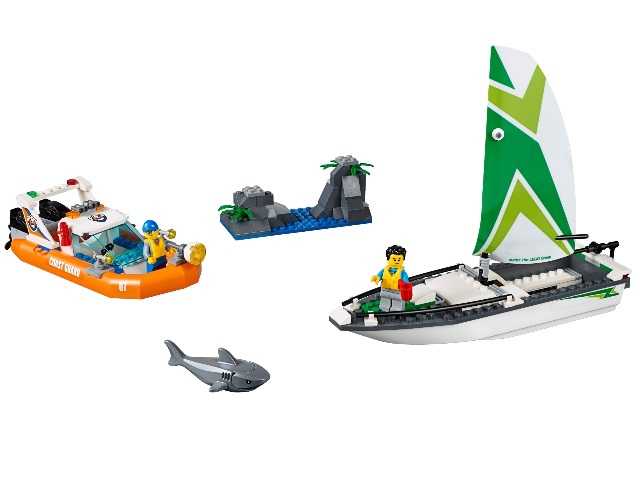 Также в наборе присутствуют детали для создания парусного судна. Оно выполнено в бело-сером цвете с добавлением контрастных зелёных акцентов. Кроме двухуровневой палубы лодка оборудована рулевым управлением, навигационными огнями, треугольным парусом и ломающейся мачтой.