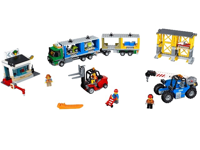В грузовом терминале Лего-города кипит работа! Длинные трейлеры привозят множество контейнеров с товарами. Их нужно быстро проверить, разгрузить и отправить на склад. Дело очень ответственное и серьёзное. Малейшая ошибка может привести к потере отправления и дальнейшей путанице. Вот почему на службе у работников терминала стоит только надёжная и функциональная техника, которая никогда не подведёт.