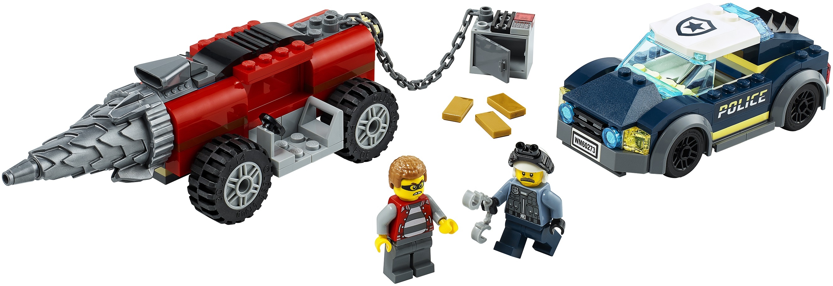 Набор Лего 60273 состоит из 179 деталей, куда также входят минифигурки полицейского и грабителя. Длина бура в собранном виде составляет 17 см, ширина 7 см, высота 5 см, длина полицейской машины – 11 см, ширина 6 см, а высота 5 см.
