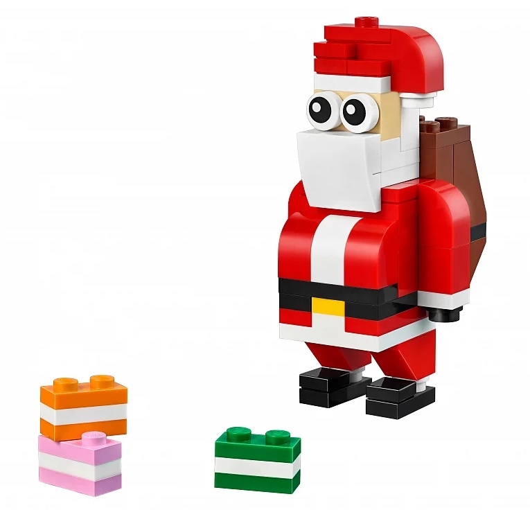 В наборе Лего 30478 Вы найдёте сборную фигурку весёлого Санты. На его голове красуется красный колпак с оригинальным помпончиком. Густая белоснежная борода аккуратно причёсана и уложена. Одежда выполнена в классическом красном цвете с контрастной оторочкой. Кафтан подпоясан чёрным ремешком с позолоченной бляшкой. На ногах видны чёрные ботинки с квадратными носами, а за спиной – огромный коричневый мешок.