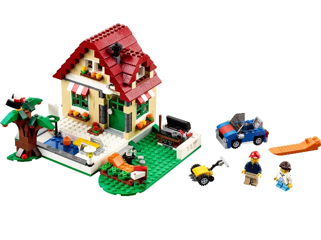 Летний домик из набора Лего 31038 представляет собой двухэтажную постройку с бежевыми стенами, зелёными окошками, красной крышей и печной трубой. Конструкция дома распашная, что позволяет детально рассмотреть интерьер.