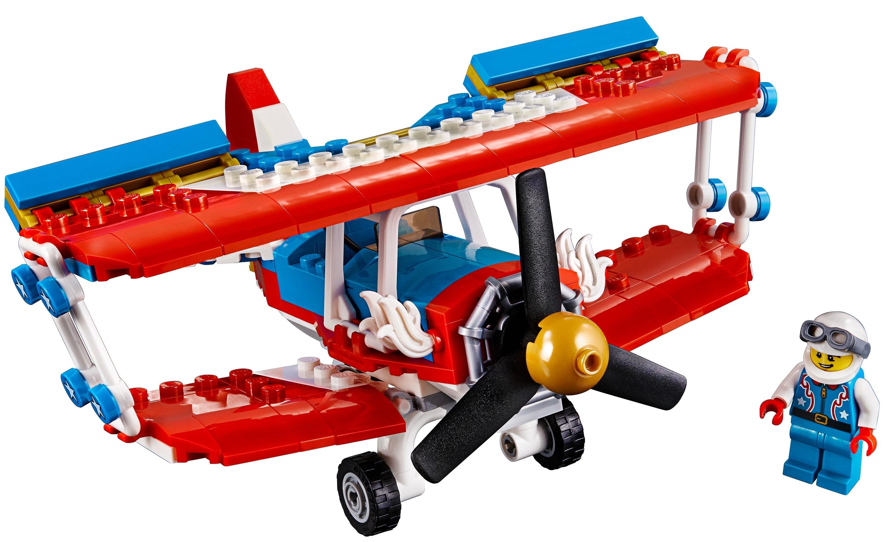 В наборе Лего 31076 Вы найдёте модель биплана. Его фюзеляж выполнен из ярких контрастных элементов. Цветовая гамма идеально подходит для участия в трюковом шоу. Красный и белый делают самолёт заметным в небе, в то время как голубой добавляет конструкции лёгкости и воздушности.