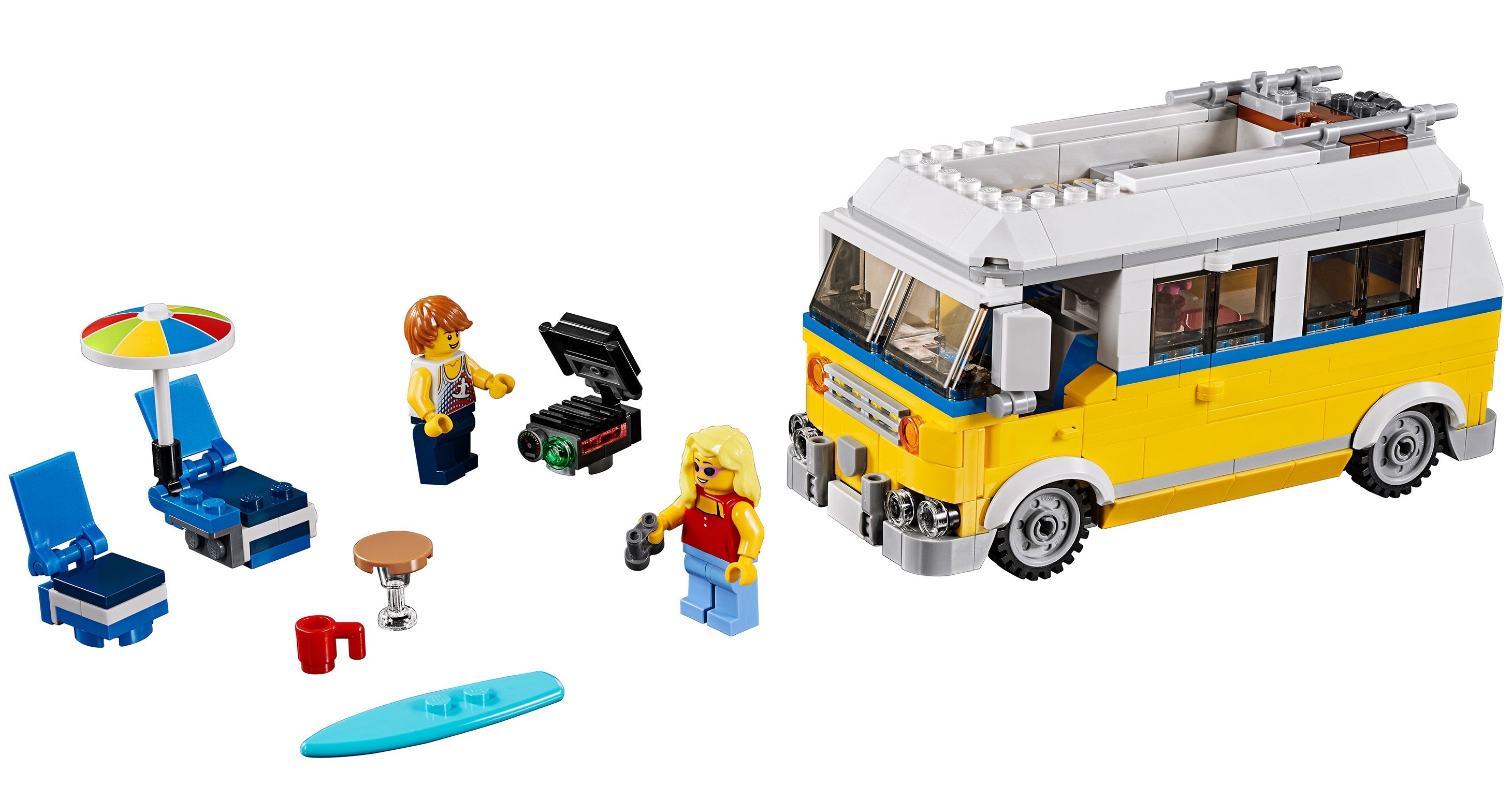 Из деталей набора Лего 31079 Вы сможете собрать подробную модель фургона. Его кузов выполнен в бело-жёлтом цвете с добавлением контрастной синей отделки. Сверху располагается прямоугольная крыша, являющаяся вместительным багажником. На ней можно разместить складную уличную мебель, гриль, пляжный зонтик и доску для сёрфинга.
