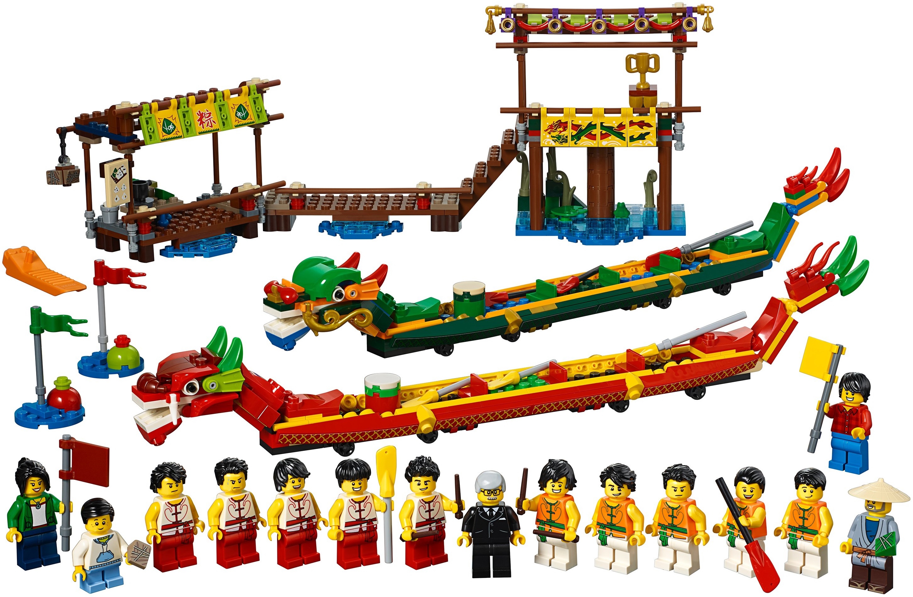 Каждая лодка в наборе Lego 80103 оснащена двигающимся хвостом и драконьей головой с открывающейся пастью. В ней предусмотрены места для рулевого, гребцов и барабанщика, задающего темп гребли. Внизу — небольшие колеса. Конструктор содержит 15 минифигурок: по три фигурки гребцов, одному рулевому и барабанщику для каждой лодки, судья, два зрителя, продавец в закусочной и мальчик.
