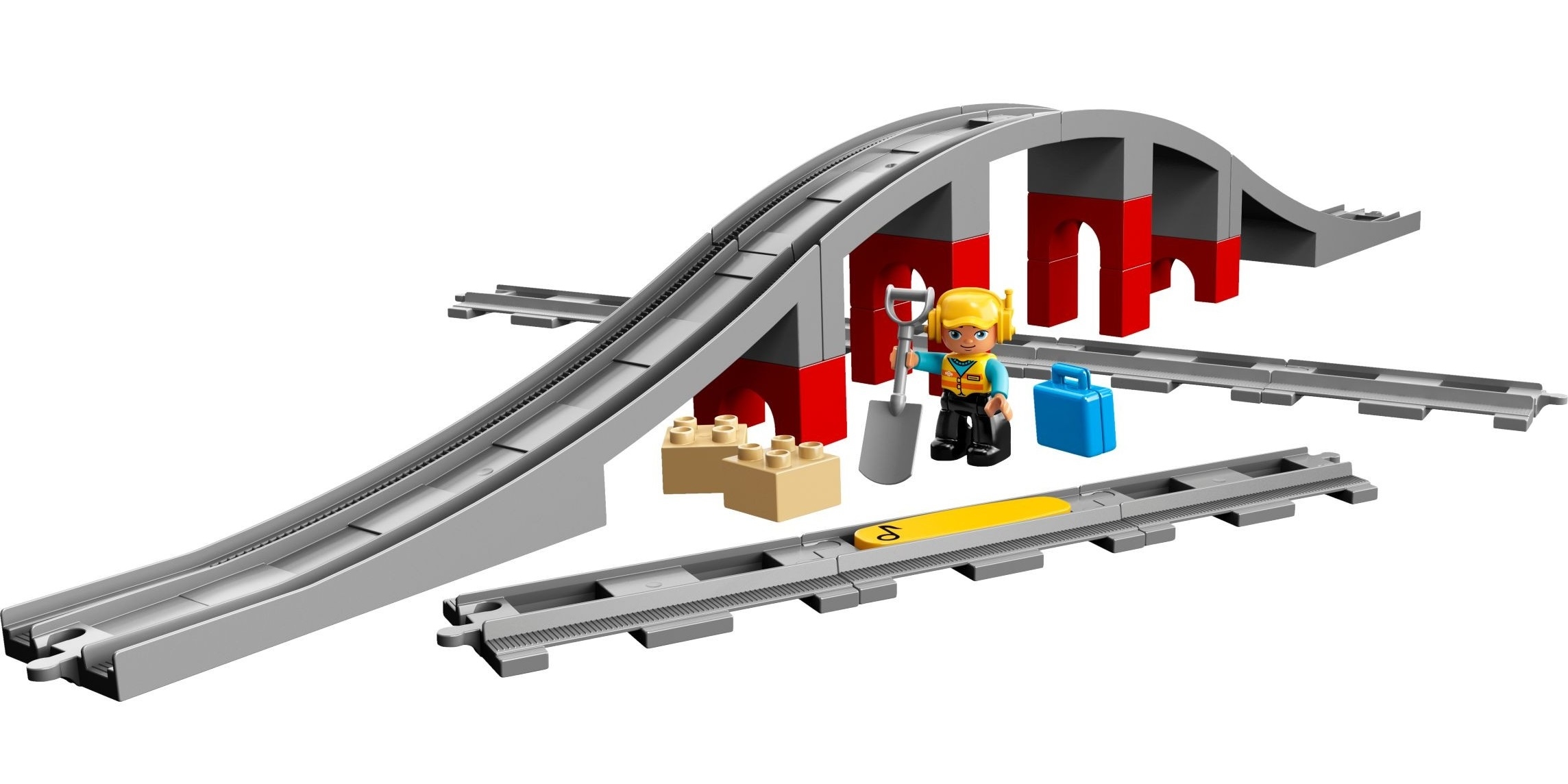 Вместе с рабочим-строителем из набора Лего 10872 приступите к возведению железнодорожного моста. Сначала разровняйте площадку с помощью совковой лопаты. Затем соедините между собой прямые рельсы и уложите их поверх подготовленного грунта.