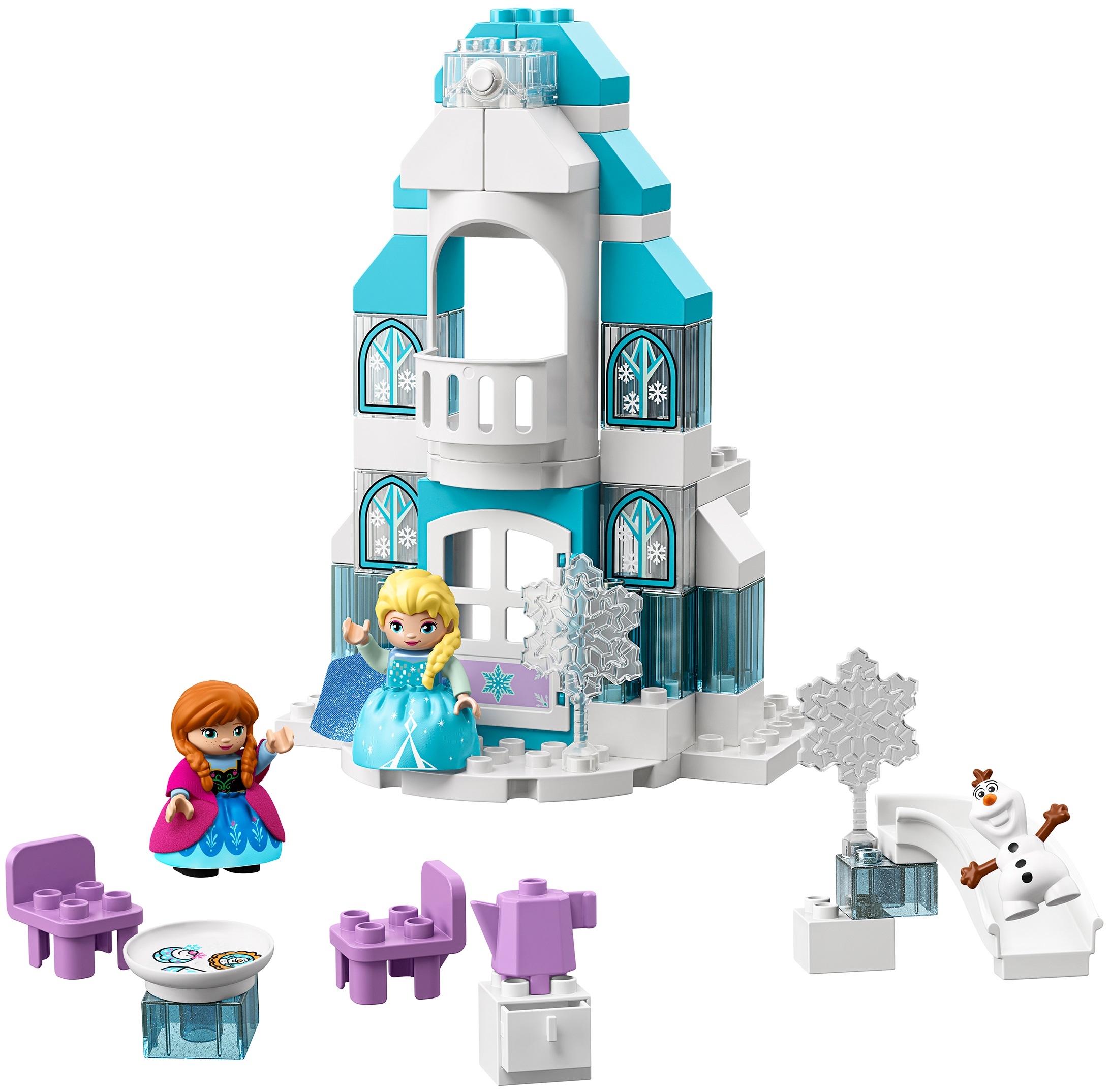 Прокатите снеговика Олафа со снежной горки, устройте чаепитие на свежем воздухе сестрам Анне и Эльзе. Эти и многие другие истории происходят с персонажами набора Lego Duplo 10899 Ледяной замок – главными героями мультфильма «Холодное сердце».
