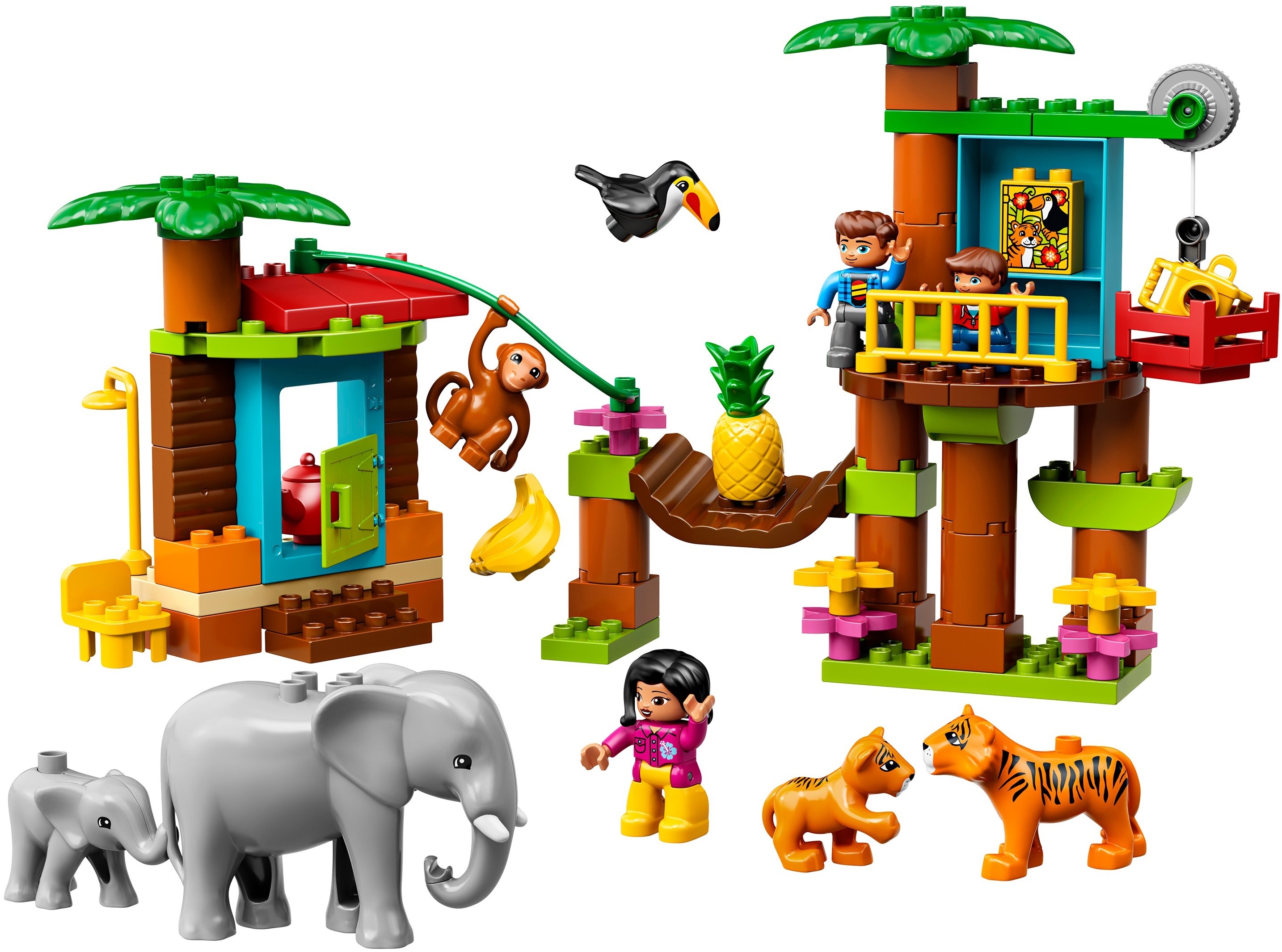 Из деталей набора Lego Duplo 10906 собирается обжитой островок в непроходимых джунглях, где любознательные путешественники наблюдают за жизнью диких животных в их естественных условиях обитания. Для комфортного проживания туристов оборудован уютный дом в кроне дерева, в котором есть все необходимое. Дом оснащен подъемным механизмом для доставки различных съестных припасов в него. Жилище на дереве украшено фотографией с изображением диких животных, населяющих джунгли.