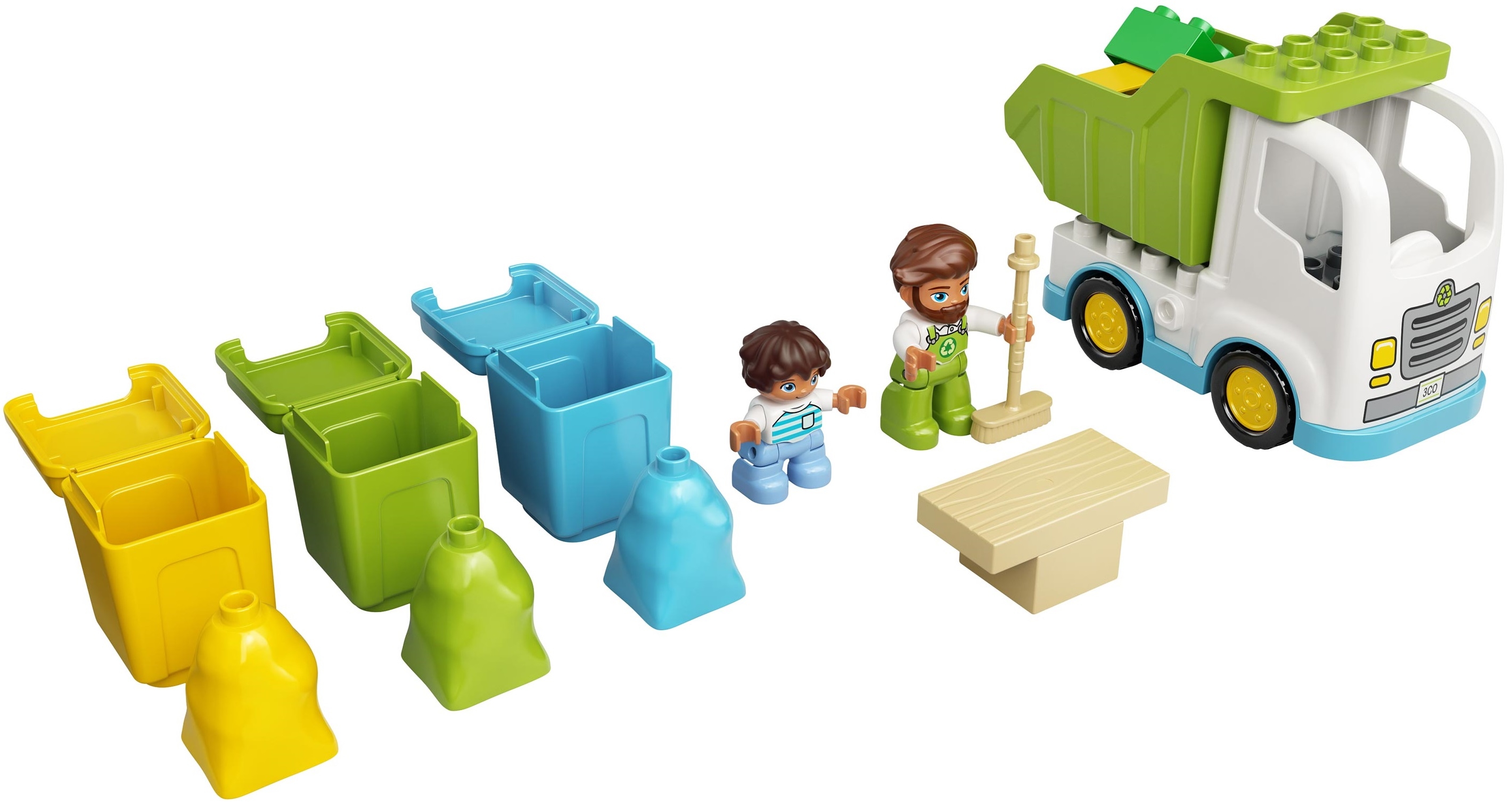 Набор Лего Дупло 10945 «Мусоровоз и контейнеры раздельного сбора мусора» поможет разобраться в правилах сортировки перед переработкой вторсырья.