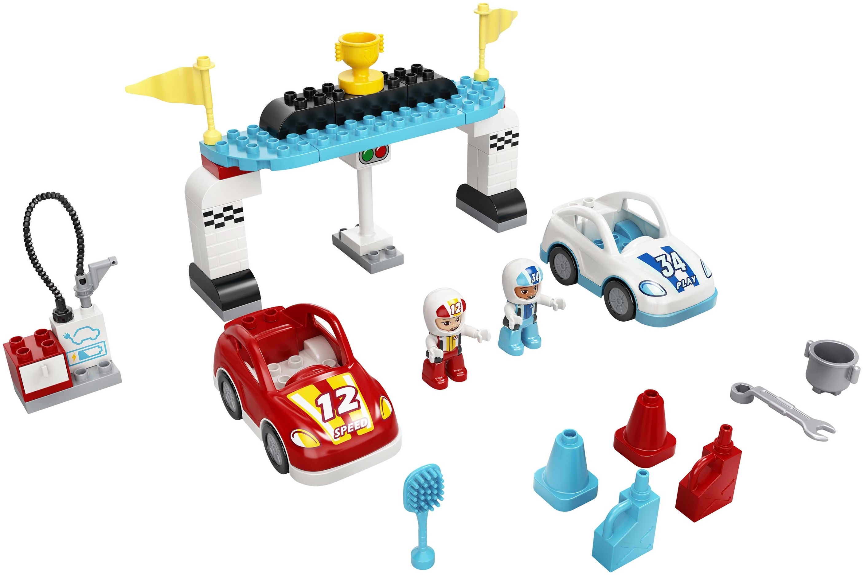 В комплект Лего 10947 входит 44 детали и две минифигурки гонщиков. Из всех элементов собирается финишная площадка высотой 19 см, которую можно собирать как по инструкции, так и на свое усмотрение, а также две гоночные машины. Машинки представлены в разных цветах, одна из них красного цвета, другая белого. Обе машинки инерционные, достаточно приложить минимум усилий, и они приятно вас удивят своей скоростью и манёвренностью.