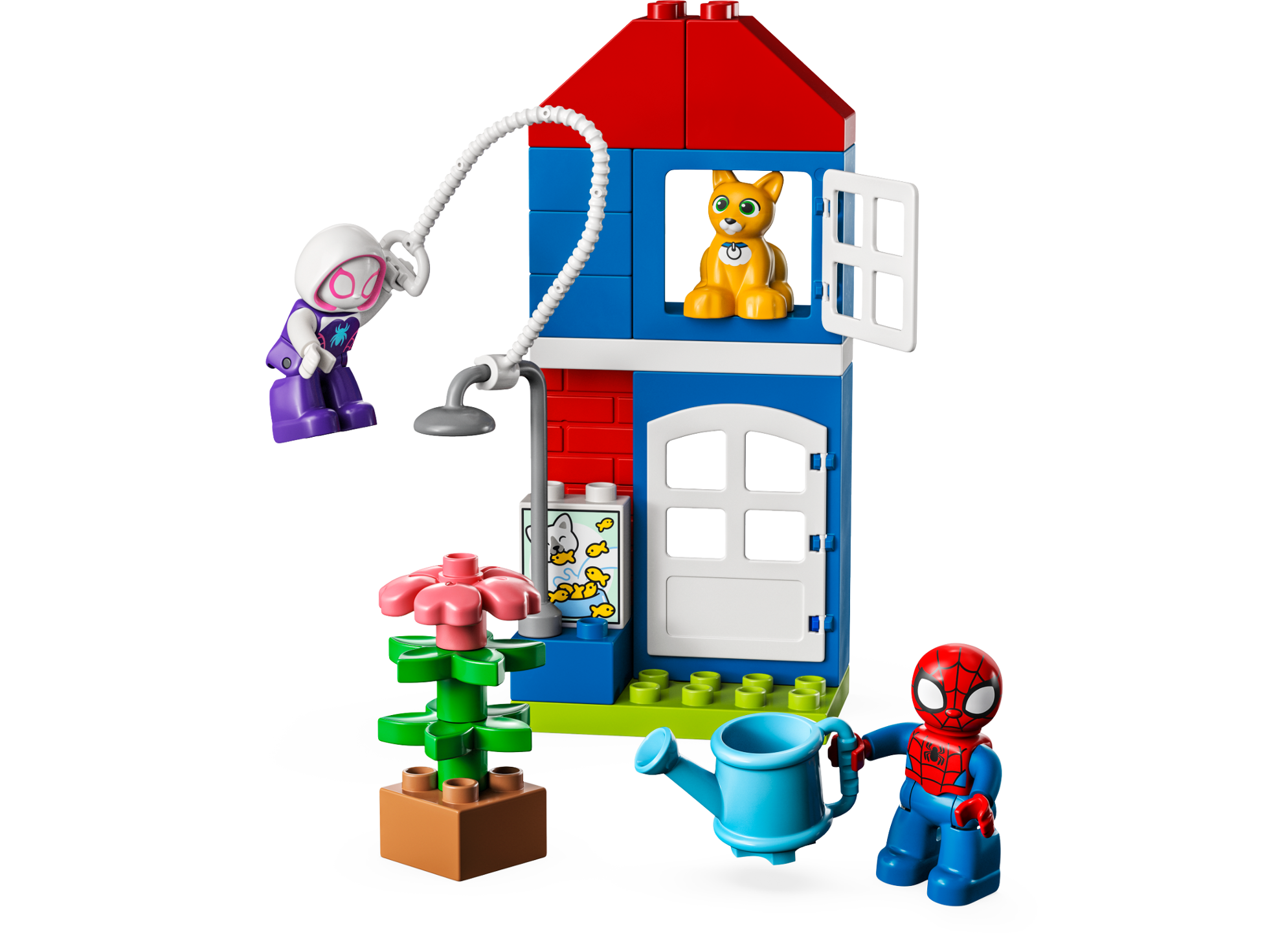С набором Лего Дупло 10995 вы сможете построить дом для Человека-паука, его подруги Гвен Стейси и рыжего кота по имени Бутси. Двухэтажный дом выполнен в традиционных цветах супергероя – синем и красном.