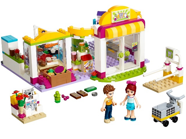 В наборе Лего 41118 присутствуют 2 куколки, а также множество аксессуаров: тележка для продуктов, газеты, цветы, арбуз, ананас, вишня, виноград, лимон, апельсин, морковь, хлопья для завтрака, сок, варенье, шоколад, куриный окорочок, сыр, рыба, суши, яблочные пироги, печенье, пирожные, молоко, бутылки, банки, расчёска, помада, 2 флакона духов, монета, денежная банкнота, список покупок, весы, щипцы, сумка и кассовый аппарат.