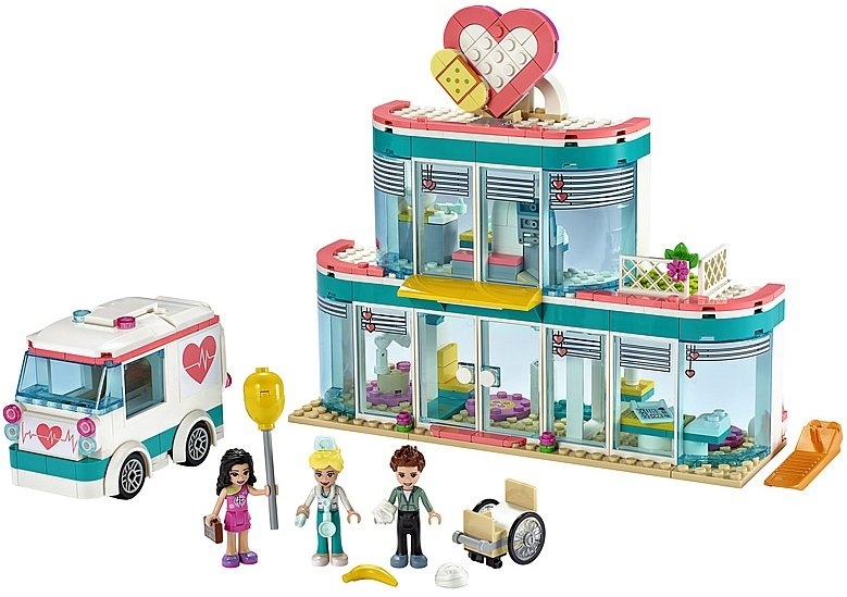 «Городская больница Хартлейк Сити» - конструктор с большим количеством аксессуаров, машиной «Скорой помощи», инвалидной коляской, тремя минифигурками и двухэтажным зданием больницы с кабинетами, оборудованными по последнему слову техники.