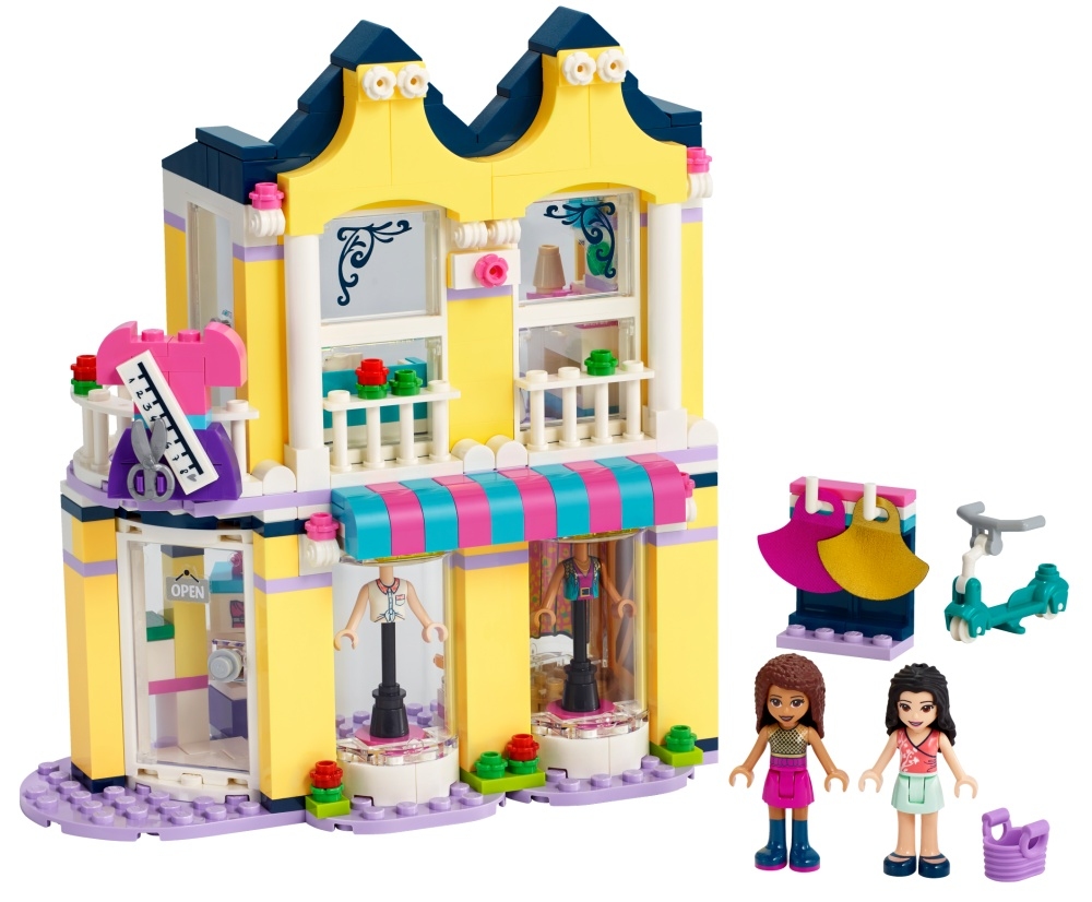 В наборе есть минифигурки Эммы и Андреа, скутер. Мебель: диванчик, столик, примерочная. Оборудование: кассовый аппарат, швейная машинка, два манекена. Аксессуары: чашка, чайничек, ножницы, ткань, две юбки.