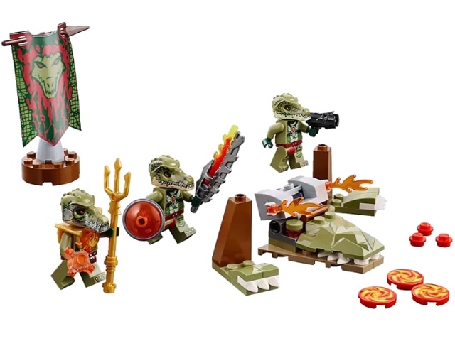 В наборе Лего 70231 Вы найдёте 3 минифигурки с оружием и аксессуарами: Генерал Крокенбург с золотым трезубцем, воин клана Крокодилов с пушкой, стреляющей красными ядрами, и воин клана Крокодилов с огненным щитом и мечом.