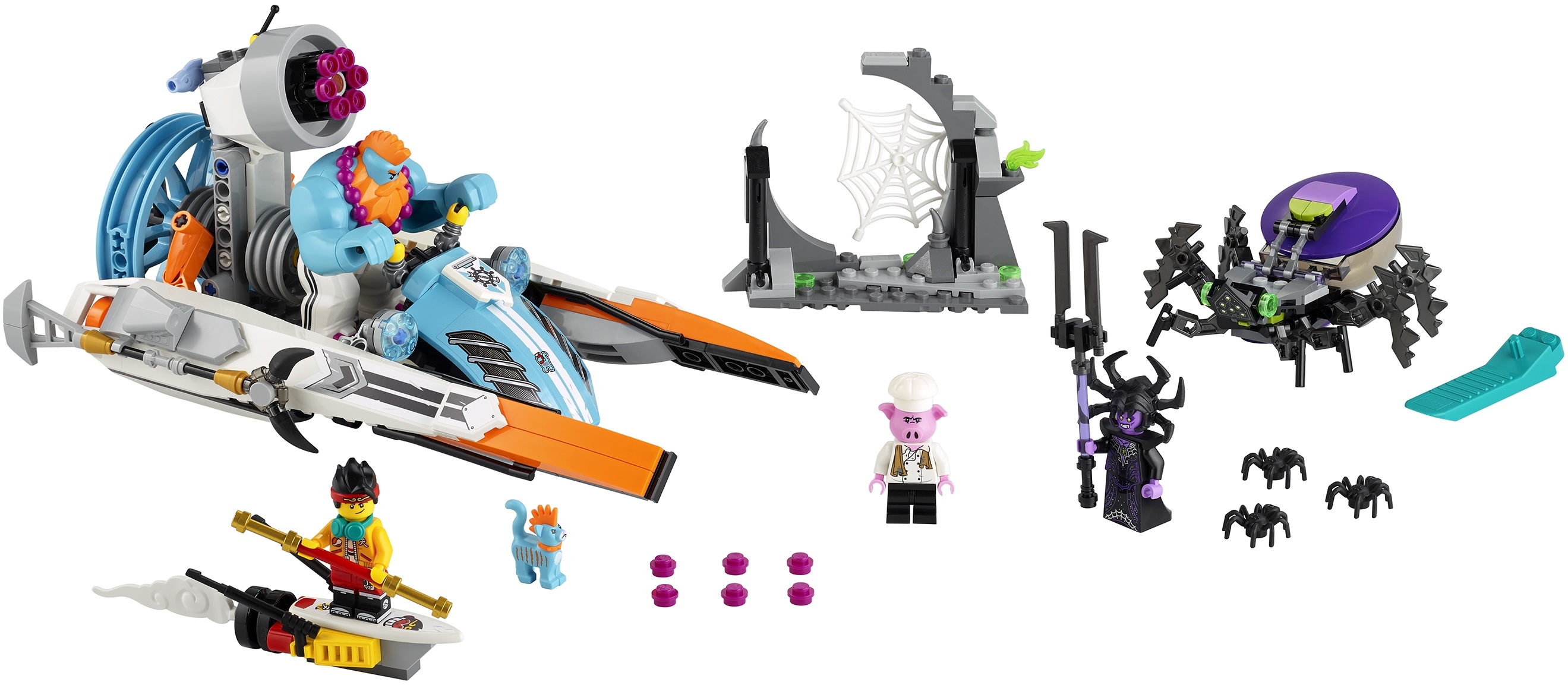 Набор 80014 состоит из 394 элементов, включающий в себя минифигурки Манки Кида, Пигси, королевы пауков, фигурку Сэнди и его кота Мо, а также трех маленьких пауков и множество интересных и необычных аксессуаров.