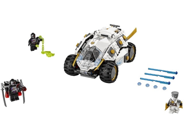 Один из злодеев притаился за большим валуном, а второй приготовился атаковать с воздуха. Но их планам не суждено было сбыться. Ниндроиды и не подозревали, с какой многофункциональной машиной они имеют дело. Снаружи корпус внедорожника покрывают белые бронированные пластины, украшенные наклейками и золотыми элементами. Спереди располагается кабина, прикрытая панорамным ветровым стеклом. Благодаря специальным креплениям, вся передняя часть кузова может раскрываться и демонстрировать водительское кресло Зейна, приборную панель с плоским экраном и острые мечи, защищающие от боковых ударов. За кабиной устроен мощный мотор, позволяющий автомобилю развивать максимальную скорость.