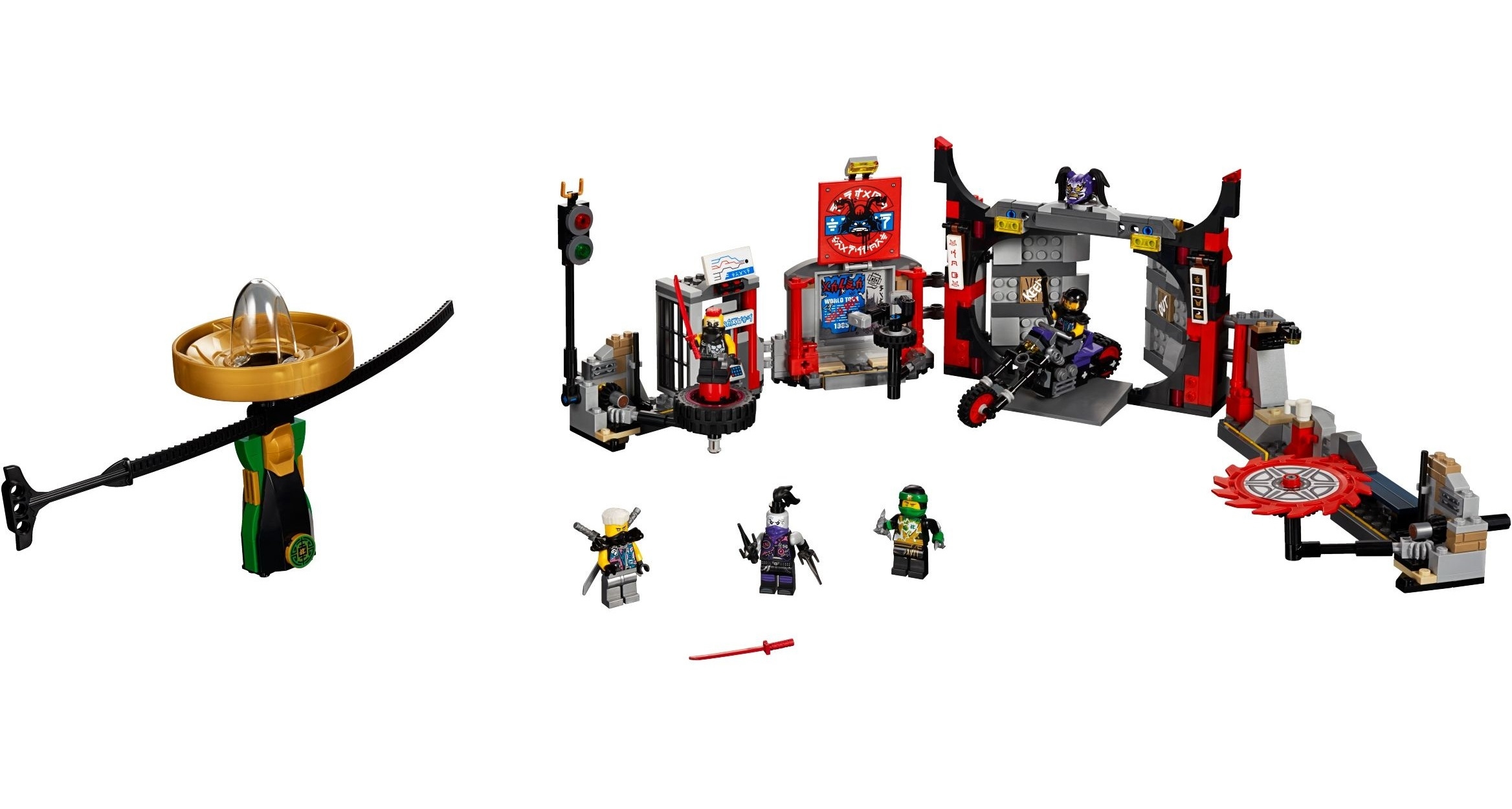 Из деталей набора Лего 70640 Вы сможете собрать модель штаб-квартиры Сынов Гармадона. Вся конструкция состоит из 5 сегментов, соединённых друг с другом подвижными креплениями. Слева виден киоск с металлическими решётками. На его крыше изображена схема метрополитена (перевод иероглифов «Поезд»), а под ней повешена прямоугольная вывеска (перевод иероглифов «Билеты»). Внизу установлен терминал по продаже проездных билетов с функцией разрушения. Рядом с ним организован проход, ведущий к светофору и огромной вращающейся шине. С помощью специального рычага, можно управлять движениями шины и использовать её в качестве подставки для минифигурки.