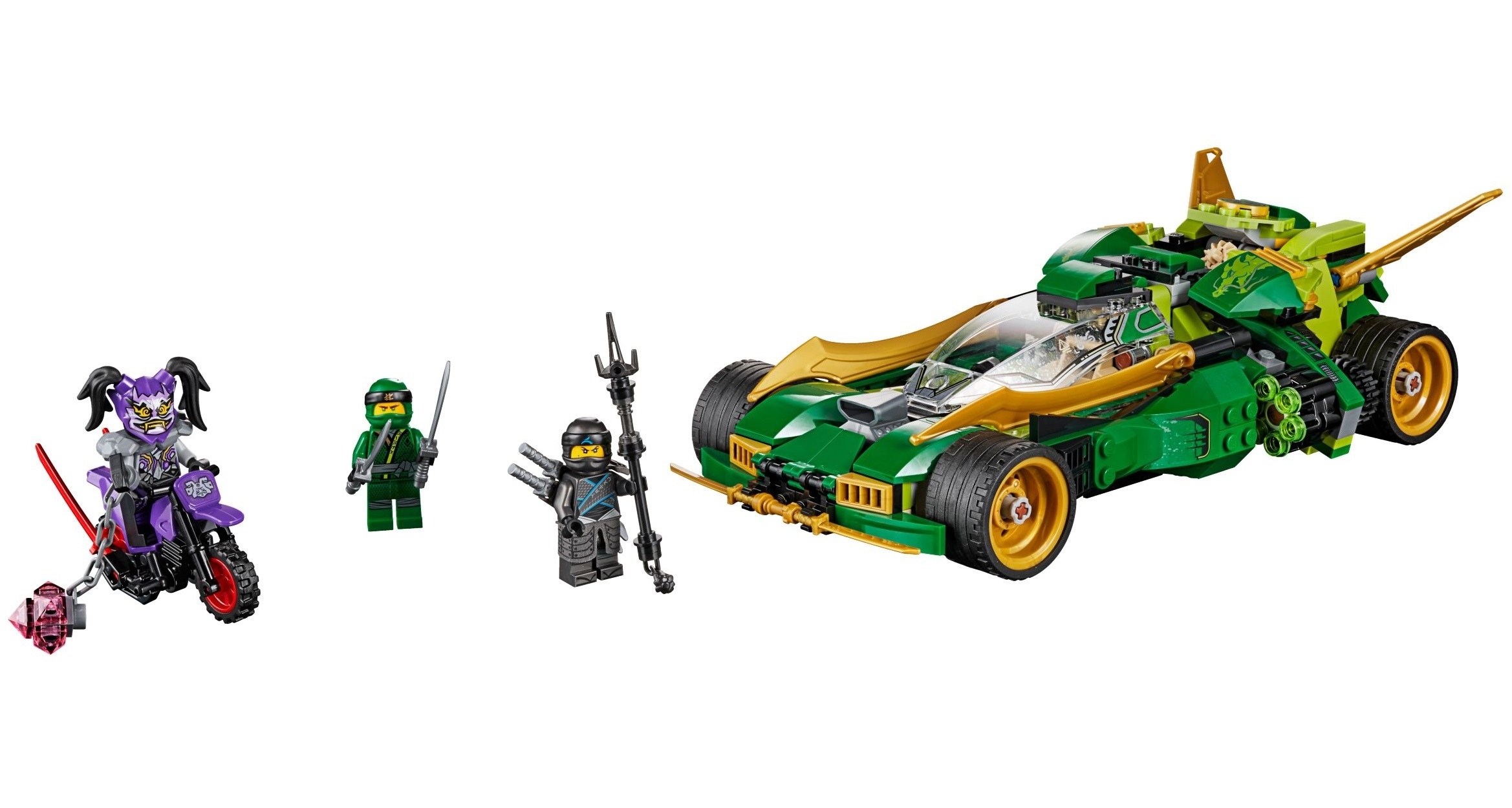 Завладев Они-маской Ненависти, Ультрафиолет мчится прочь из города на своём реактивном мотоцикле. Злодейке нужно как можно скорее покинуть пределы Ниндзяго Сити и спрятаться в тайном логове Сынов Гармадона. Но ниндзя-защитники не дремлют. Сев за руль маневренного вездехода, Ллойд отправился в погоню. Догнать байкершу не составило труда, а вот остановить её и забрать магический артефакт никак не получалось. Ультрафиолет ловко уклонялась от всех таранящих ударов и прицельных выстрелов. Хорошо, что Ния оказалась неподалёку. С помощью своего длинного копья она совершила головокружительный прыжок и сбила приспешницу Гармадона с мотоцикла. Теперь только честный поединок решит, кому достанется заветная маска.