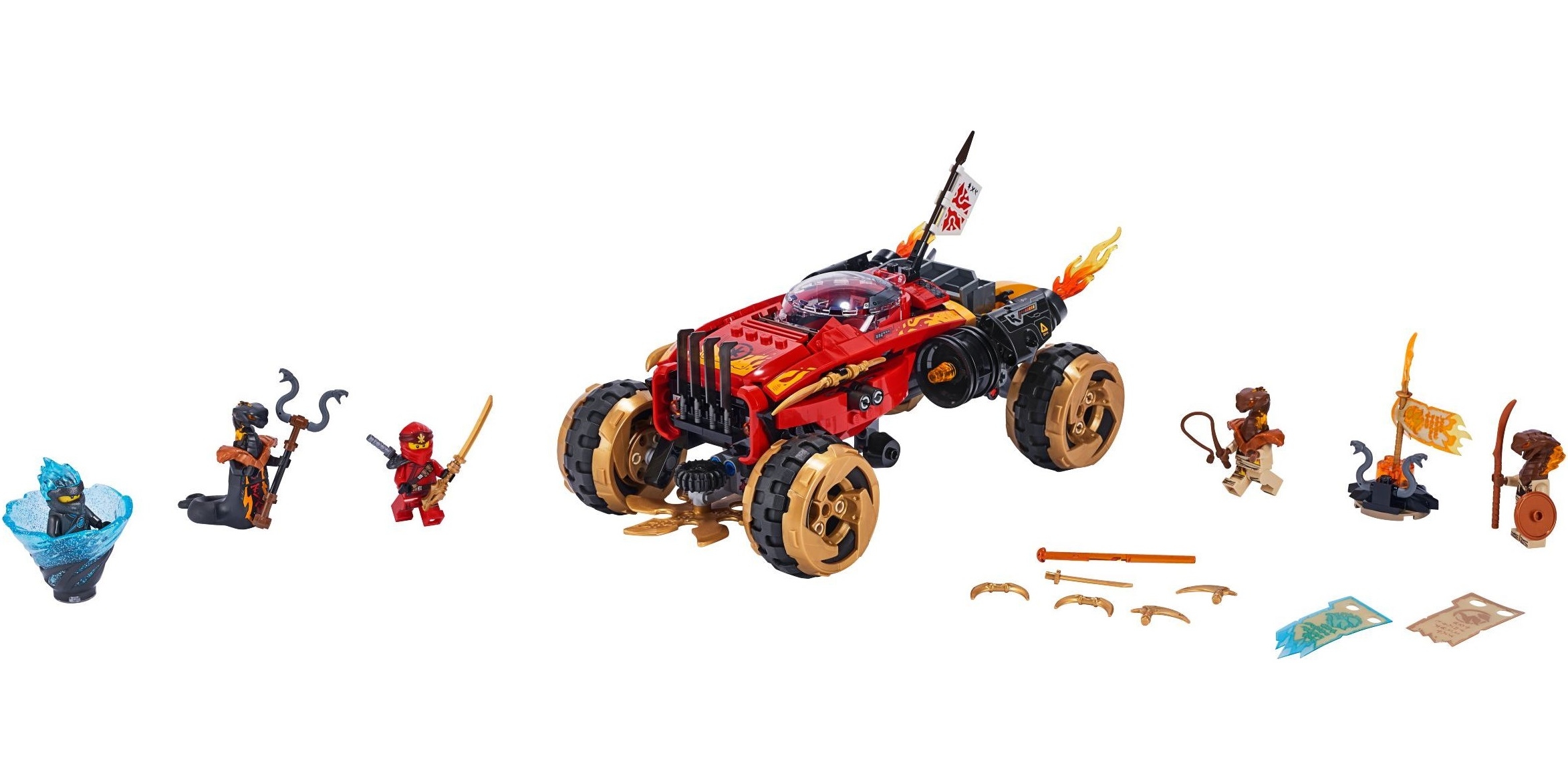 В наборе Лего Ниндзяго 70675 Katana 4×4 есть пять минифигурок: Кай, Ния, Змей Чар, Поджигатель и Уничтожитель.