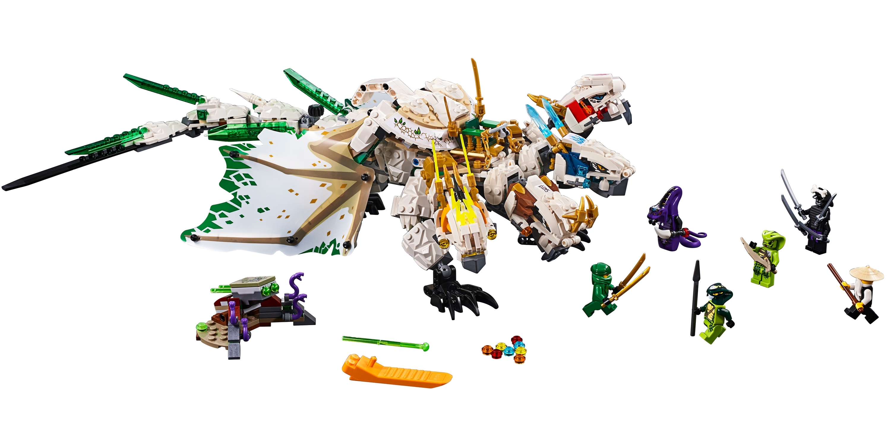 Купи 70679 Лего в нашем интернет-магазине, чтобы построить необычного дракона. Посмотри, какие огромные у него хвост и крылья, как воинственно щелкают челюсти каждой из четырех голов! На спине этого ящера есть место для Ллойда и Мастера Ву. Головы Ультрадракона по бокам оснащены шутерами для прицельной стрельбы.
