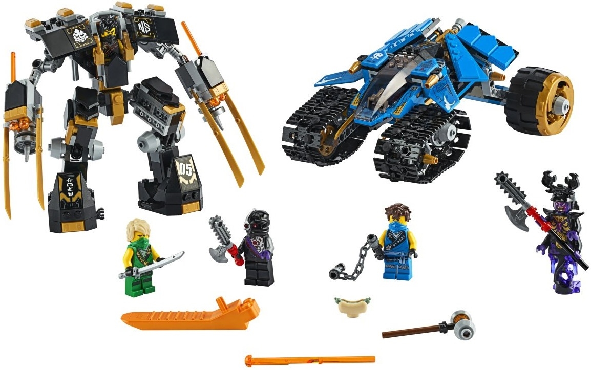 Из деталей конструктора собираются транспорт для Джея, и робот-мех для Коула. Внедорожник-молния выполнен в ярко-синих цветах с золотистыми вставками. Кабина внедорожника легко открывается, располагая там минифигурку для управления. По бокам машина оборудована золотыми мечами-катанами и рядом пушек. Передние подвижные гусеницы и массивные колеса сзади позволяют внедорожнику с легкостью преодолевать самые труднопроходимые места.
