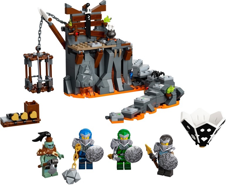 Набор Лего 71717 состоит из 401 элемента и включает в себя минифигурки героев: Ллойда, Нии, Джея и злобного Мурта. Все фигурки ниндзя экипированы защитными шлемами, наплечниками, оружием и щитом с принтом дракона. Основным элементом конструктора Lego, где развиваются главные события игры, является зловещее подземелье. По всей скале разливается горящая лава, выполненная из прозрачно-оранжевых деталей. На вершине горы обитает злобный орк, который сторожит драгоценные камни и волшебный меч, также на стене установлено специальное колесо, с помощью которого можно поднимать или опускать клетку с пленными. Но, чтобы подняться на вершину, необходимо пройти сложный подъём, где скрыто множество ловушек. Попав на ступеньку с изображением скелета, нажимая сбоку на небольшой рычаг, ниндзя улетает высоко в небо.