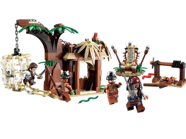 В комплект конструктора Лего 4182 входят 4 миниатюрные фигурки, а также детали, из которых можно соорудить домик каннибалов, трон их предводителя и даже настоящий вертел, на котором людоеды хотят зажарить своих непрошенных гостей.