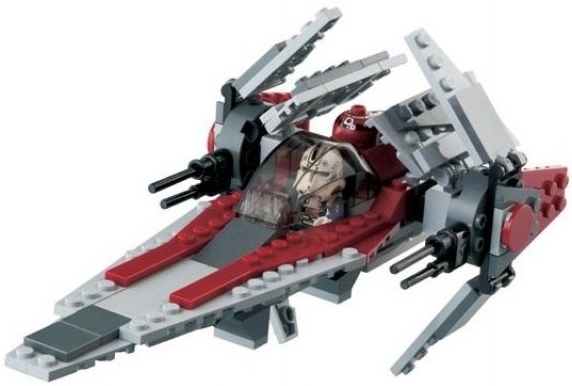V-wing из набора Лего 6205 – это боевой истребитель, который широко использовался Галактической Республикой во времена Войн клонов. Он имеет клиновидную форму с откидными крыльями радиаторных панелей. Корпус выполнен из серых и красных деталей. Кабина пилота находится в центральной части истребителя. Она прикрыта непробиваемым тонированным стеклом. Внутри есть место только для одного пилота-клона. За кабиной предусмотрена небольшая ниша для размещения дроида-астромеханика Q7.