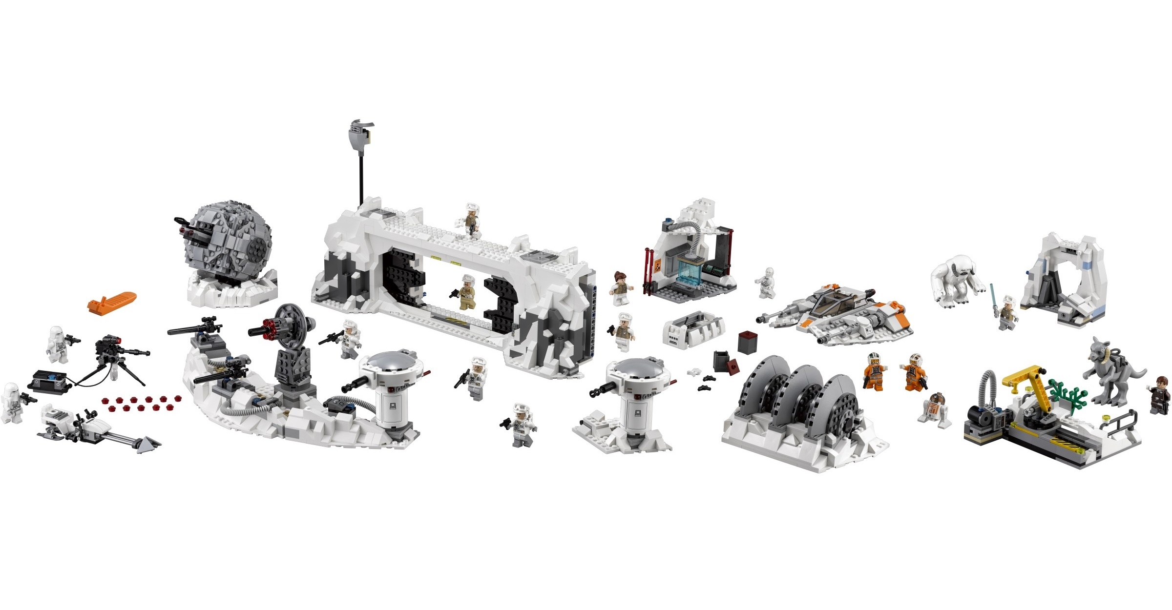 Размер главного ангара с боевой вышкой составляет 15х51х30 см, также в набор входит снеговой спидер (5х18х17 см), генератор (8х16х13 см), траншея (10х35х11 см) и имперский спидер (3х13х4 см).