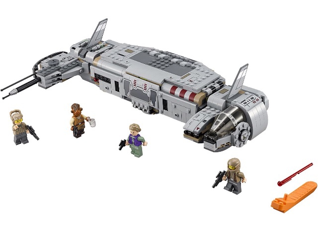Из деталей набора Лего 75140 Вы сможете построить оригинальную модель боевого корабля Сопротивления. Его корпус, покрытый серыми бронированными пластинами, имеет нестандартную сигарообразную форму. В центре располагается командный пункт, попасть в который можно через опускающуюся боковую стенку, превращающуюся в пандус. Благодаря откидывающимся сегментам крыши, весь интерьер корабля доступен для изучения и игры. Здесь есть три посадочных места для экипажа, приборные панели и держатели для бластеров. Справа от командного пункта видна кабина пилота с обтекаемым лобовым стеклом. Используя вращающийся диск, его можно плавно поднять и рассмотреть рулевое управление. В левой части корабля сосредоточено навигационное и боевое оборудование. Длинные антенны и датчики передают координаты местонахождения истребителей противника, а мощные пусковые ракетницы бьют точно в цель.