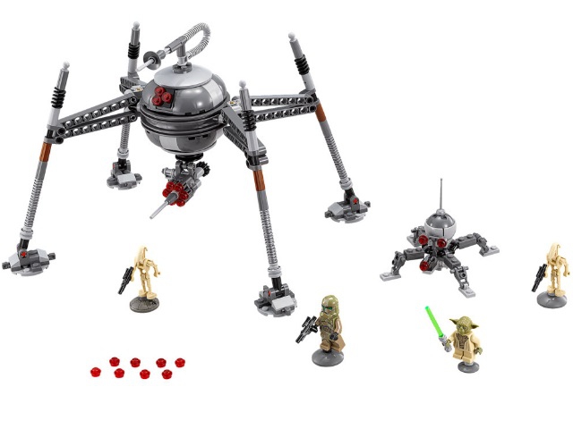 Из деталей набора Лего 75142 Вы сможете построить самонаводящегося дроида-паука (высота 18 см) с подвижными опорами, вращающейся лазерной пушкой, системой датчиков и шестизарядным противопехотным орудием. Также в наборе Вы найдёте элементы для создания карликового дроида с длинной антенной, двумя сканерами, активными конечностями и центральным лазером, напоминающим заостренный нос.