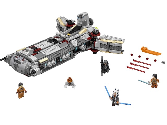Из деталей набора Лего 75158 боевой фрегат повстанцев. Его вытянутый корпус покрывают бронированные пластины серого цвета. Спереди видена кабина пилота с закруглённым стеклом. По бокам от неё располагаются ионные орудия, а под ними - два пружинных шутера, бьющих точно в цель. Дополнительным вооружением служат две вращающиеся турели, закреплённые на хвосте корабля. Центральная часть фрегата оборудована съёмной прямоугольной крышей. Подняв её, можно получить доступ к интерьеру всего воздушного судна. Здесь есть место пилота, окружённое подробной панелью управления, капитанский мостик с дисплеем, два посадочных места для экипажа и крепления для световых мечей или дополнительных боеприпасов.