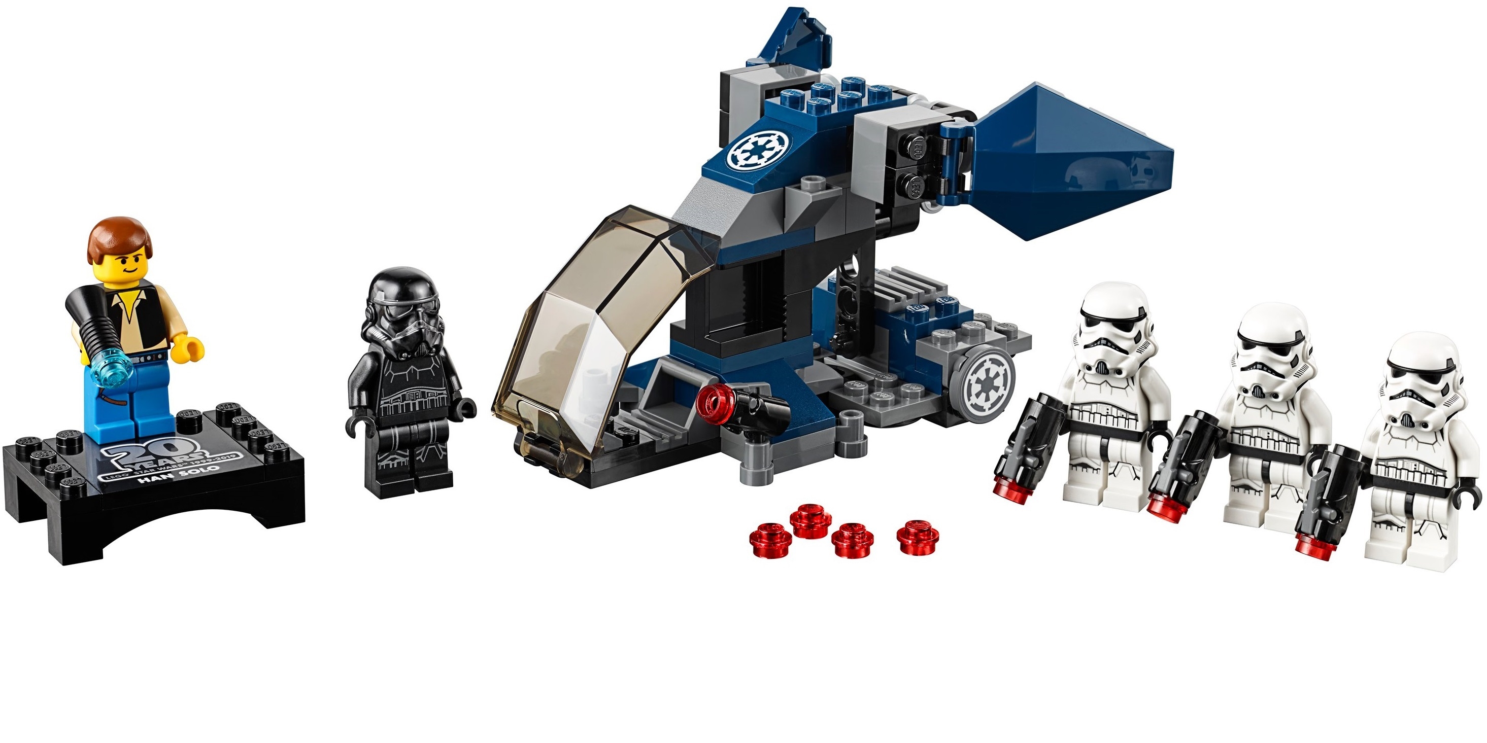 В набор Лего 75262 вошли 5 минифигурок: три воина-штурмовика, один штурмовик-тень Империи, а также эксклюзивная фигурка Хана Соло. Это точная копия минифигурки 2000 года на специальной юбилейной подставке с принтами, посвященными 20-летию.
