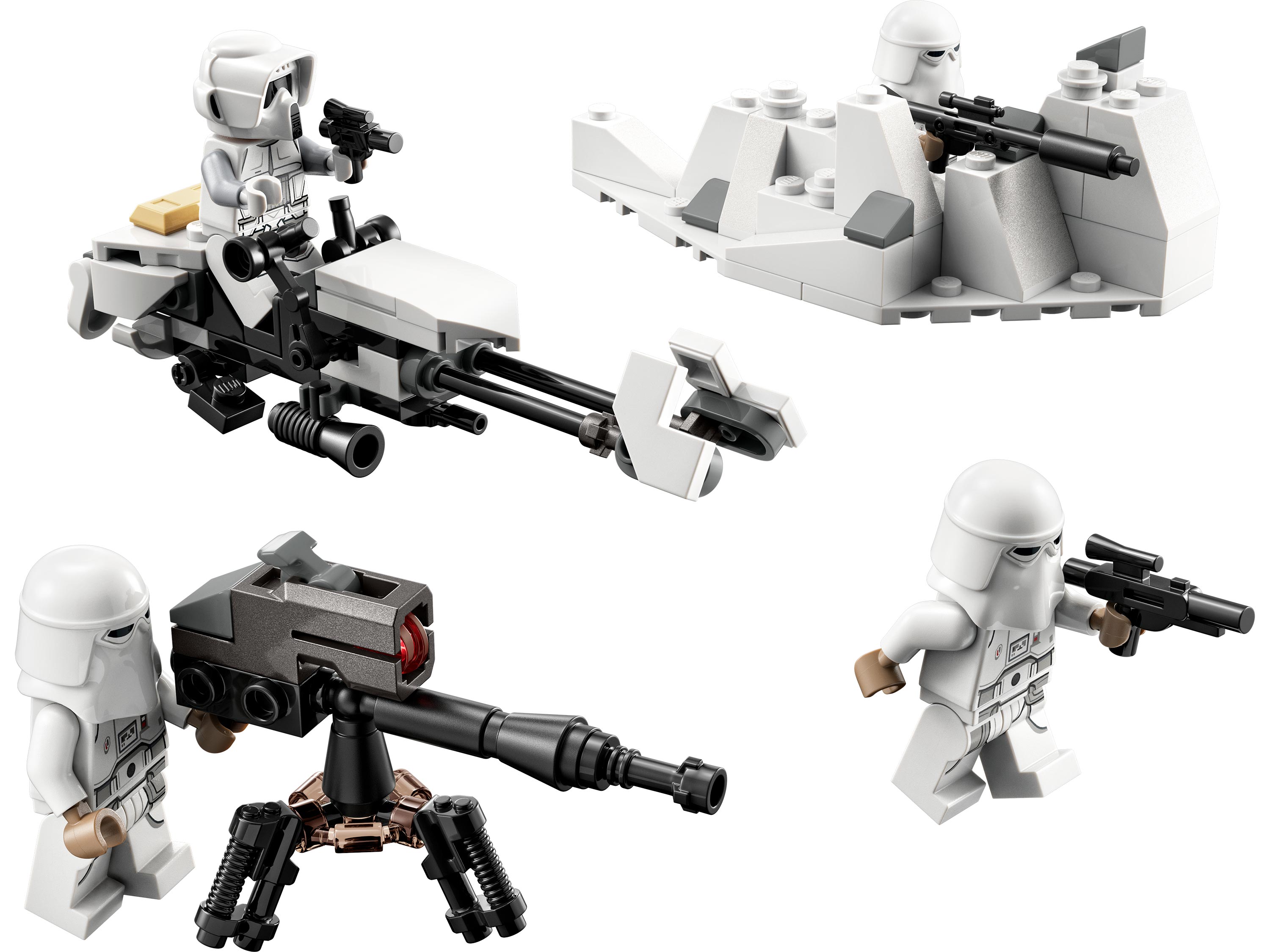 В набор Лего 75320 Звездные войны также входят Имперский спидер, вооруженный лазерной пушкой, и снежная траншея с боеприпасами. Кроме того, ты можешь собрать тяжёлый бластер E-Web, стреляющий шипами, с расположенной наверху встроенной функцией выстрела. Пехотинцы вооружены бластерной винтовкой, двумя боевыми бластерами и бластерным пистолетом.