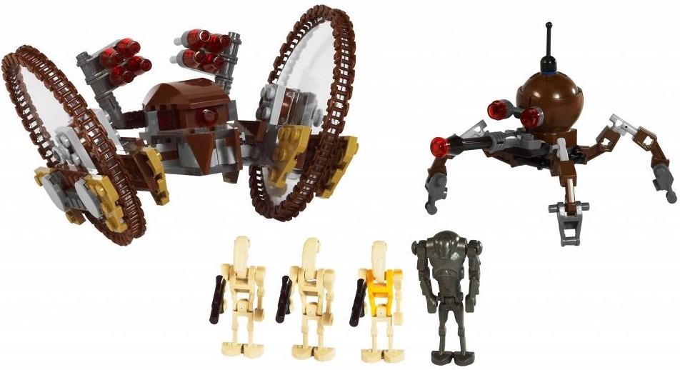 В наборе Вы найдёте не только мощные военные машины, но и минифигурки двух боевых дроидов, их командира и одного супер боевого робота.