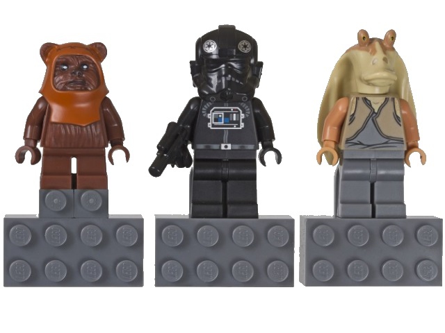 В наборе Лего 853414 Вы найдёте трёх персонажей, связанных с историческими битвами на Эндоре и Набу: эвок Уикет, гунган Джар-Джар Бинкс и пилот истребителя V-Wing, вооружённый бластером.