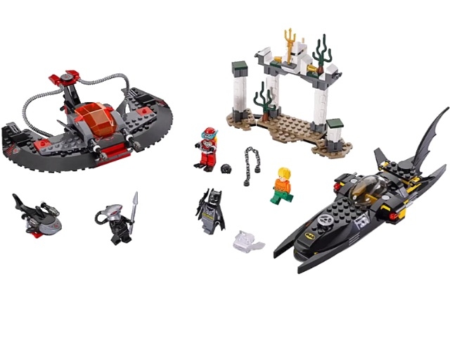 Также в наборе Лего 76027 Вы найдёте разрушенный подводный город, робота-акулу и 4 минифигурки с оружием и аксессуарами: Чёрная Манта, Бэтмен, Аквамен и Робин.